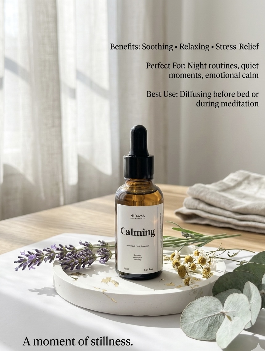 Calming is a gentle, aromatherapeutic blend designed to quiet the mind and soften the edges of a busy day. Lavender leads with its soothing floral warmth, while eucalyptus adds a breath of fresh clarity. Chamomile rounds the blend with a comforting, serene softness. Perfect for unwinding, bedtime rituals, or creating a peaceful atmosphere in any space.