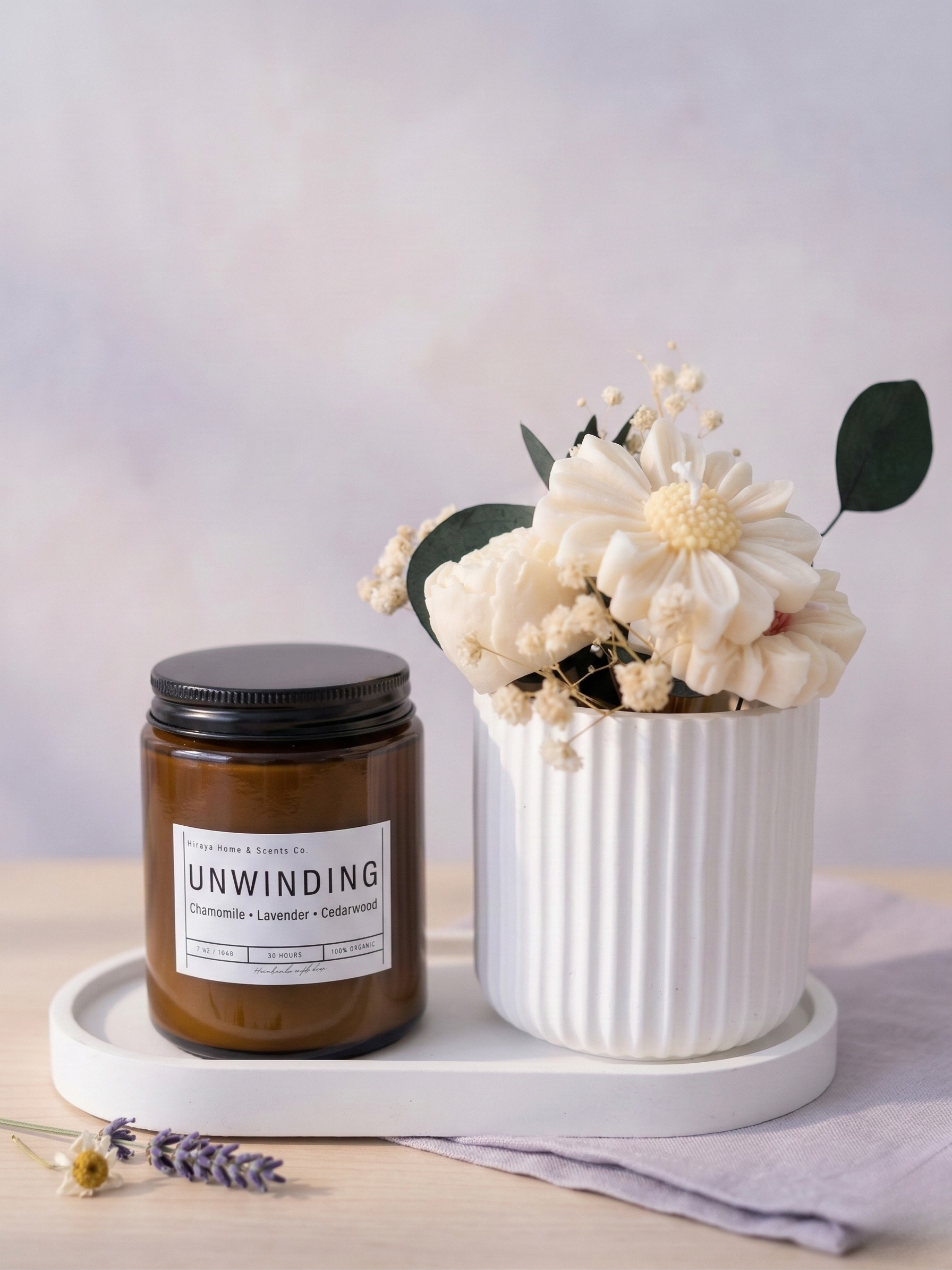 Crafted with Chamomile, Lavender, and Cedarwood, Unwinding is designed to ease the mind into a state of quiet release. Chamomile softens tension, Lavender calms the spirit, and Cedarwood grounds the body — creating a soothing blend that helps you transition from a long day into peaceful stillness.