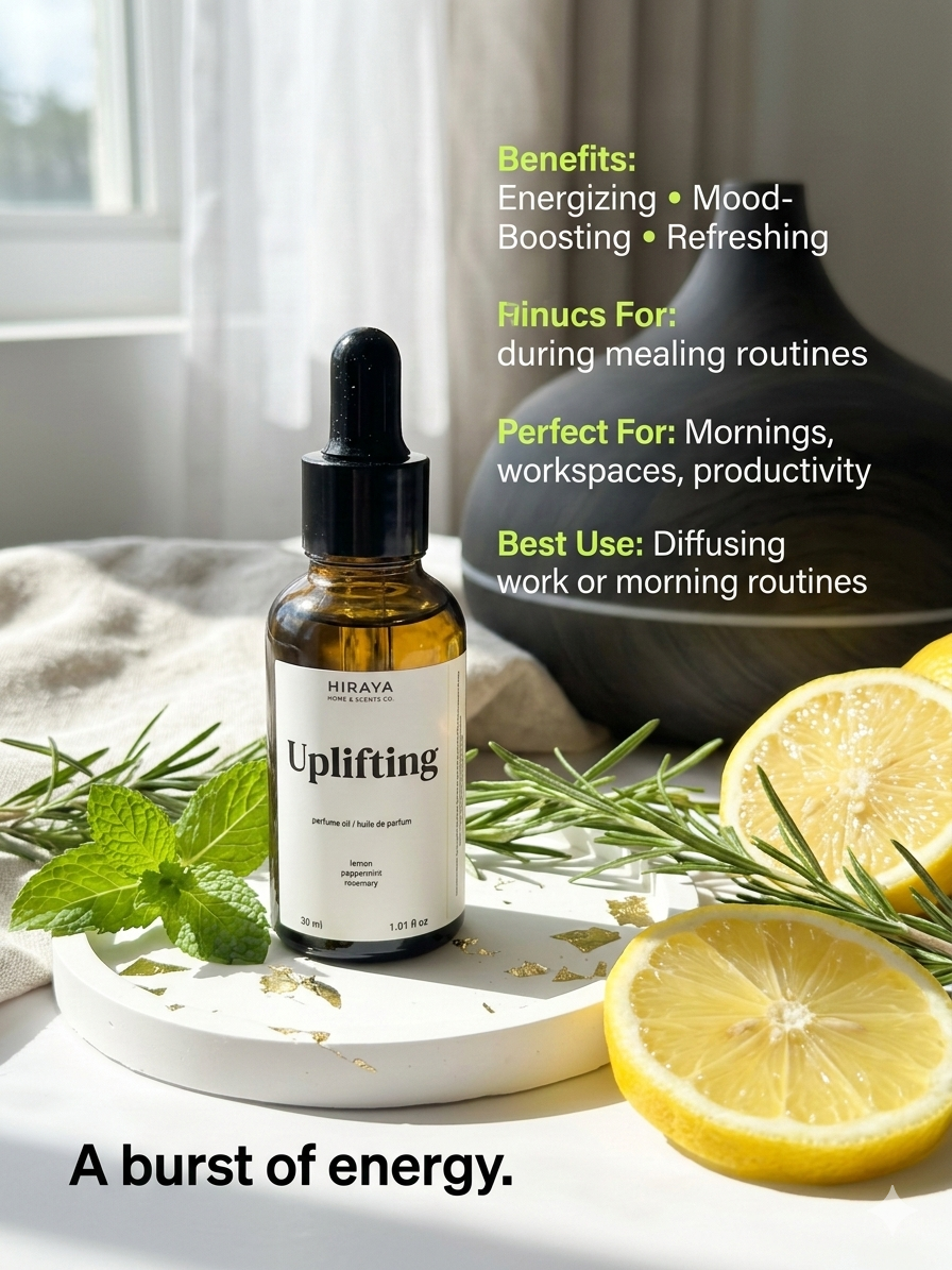 Uplifting is a bright, energizing blend crafted to refresh your mood and sharpen your focus. Lemon brings a burst of citrus positivity, peppermint adds a crisp, cooling lift, and rosemary delivers a stimulating herbal clarity. Ideal for workspaces, morning routines, or anytime you need a natural boost.