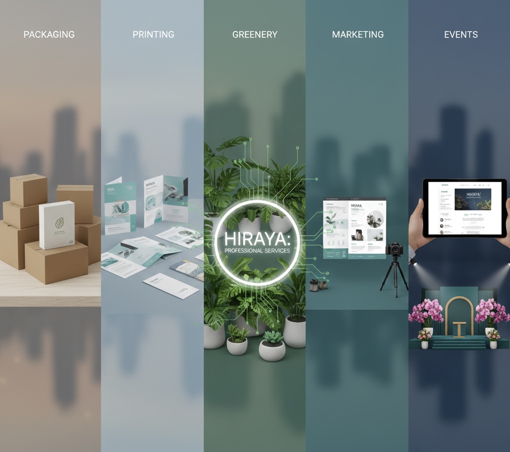 Professional services in packaging, printing, greenery, marketing, and events — designed to bring clarity, beauty, and purpose to every project.